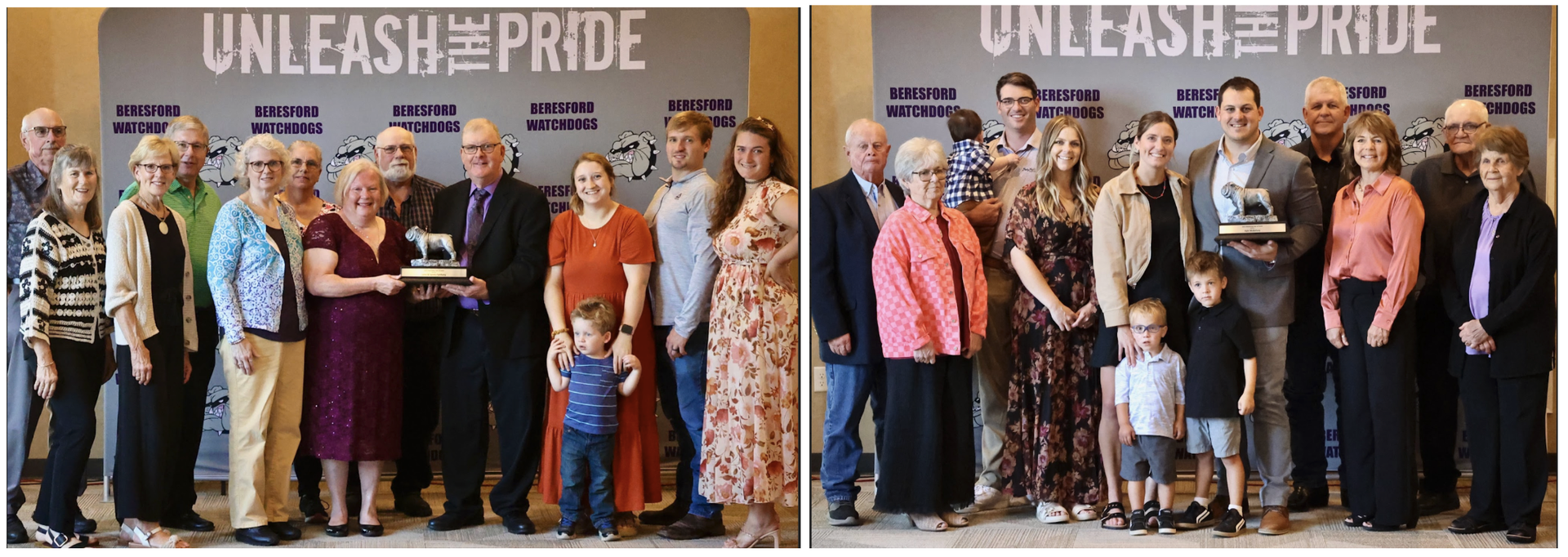 The eighth Watchdog Hall of Fame induction ceremony was held on Saturday, September 27, 2025, at 7:00 p.m. (Bridges of Beresford). At 6:00 p.m., inductees, friends, family, and community members enjoyed a catered banquet from Cleavers. Ninety-six people enjoyed the meal. During the evening, Dr. Kristin Olbertson (Academics), John and Sandy Fahlberg (Fine Arts), Mr. Kyle McKelvey (Athletics), Mr. Wayne Haensel (Athletics), and Mr. Kevin Nelson (Distinguished Service) were inducted into the Watchdog Hall of Fame.