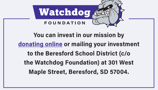 The Watchdog Foundation supports the Beresford School District by connecting alumni, providing scholarships, and awarding grants. The Watchdog Foundation accepts memorials and monetary gifts. Gifts and memorials help immortalize the legacy of loved ones and friends. Donations make lasting impacts that help the Beresford community. After your donation is deposited, you will receive a statement from the South Dakota Community Foundation for tax purposes.